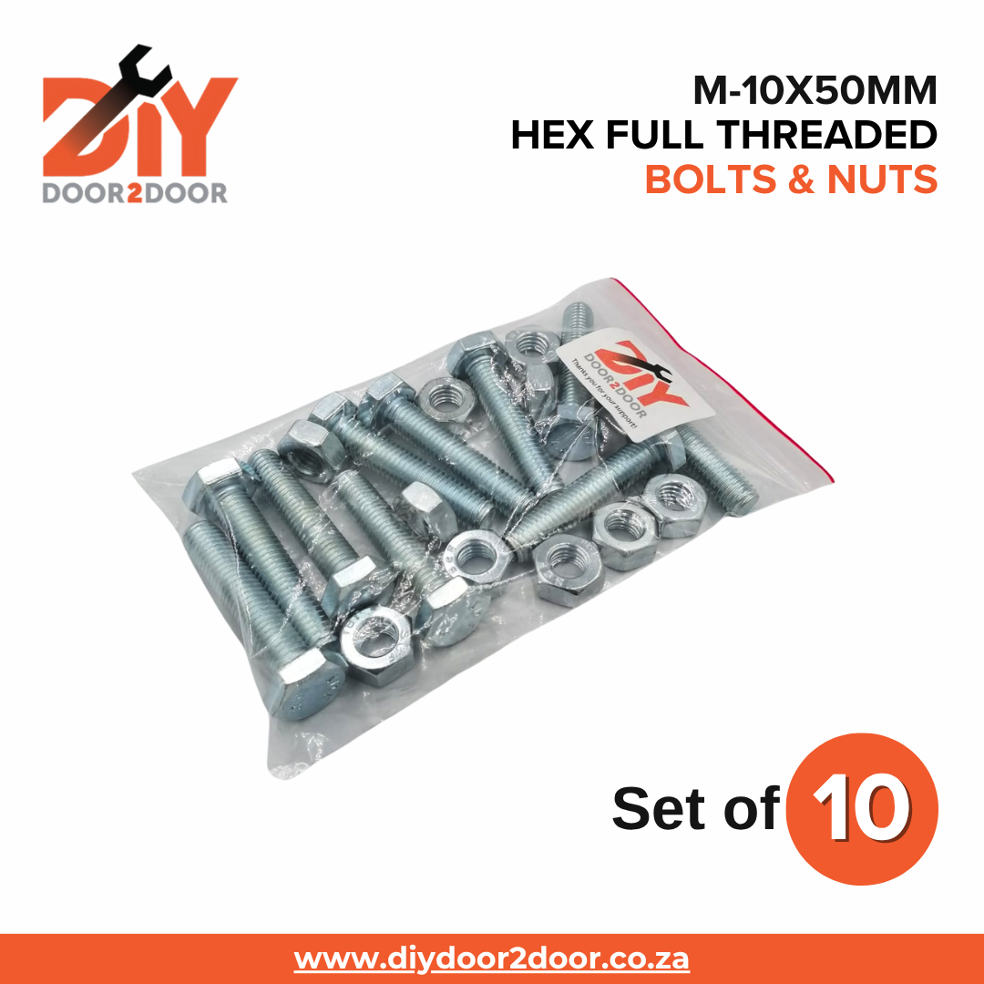 10PCS M-10X50MM HEX FULL THREADED BOLTS & NUTS SET