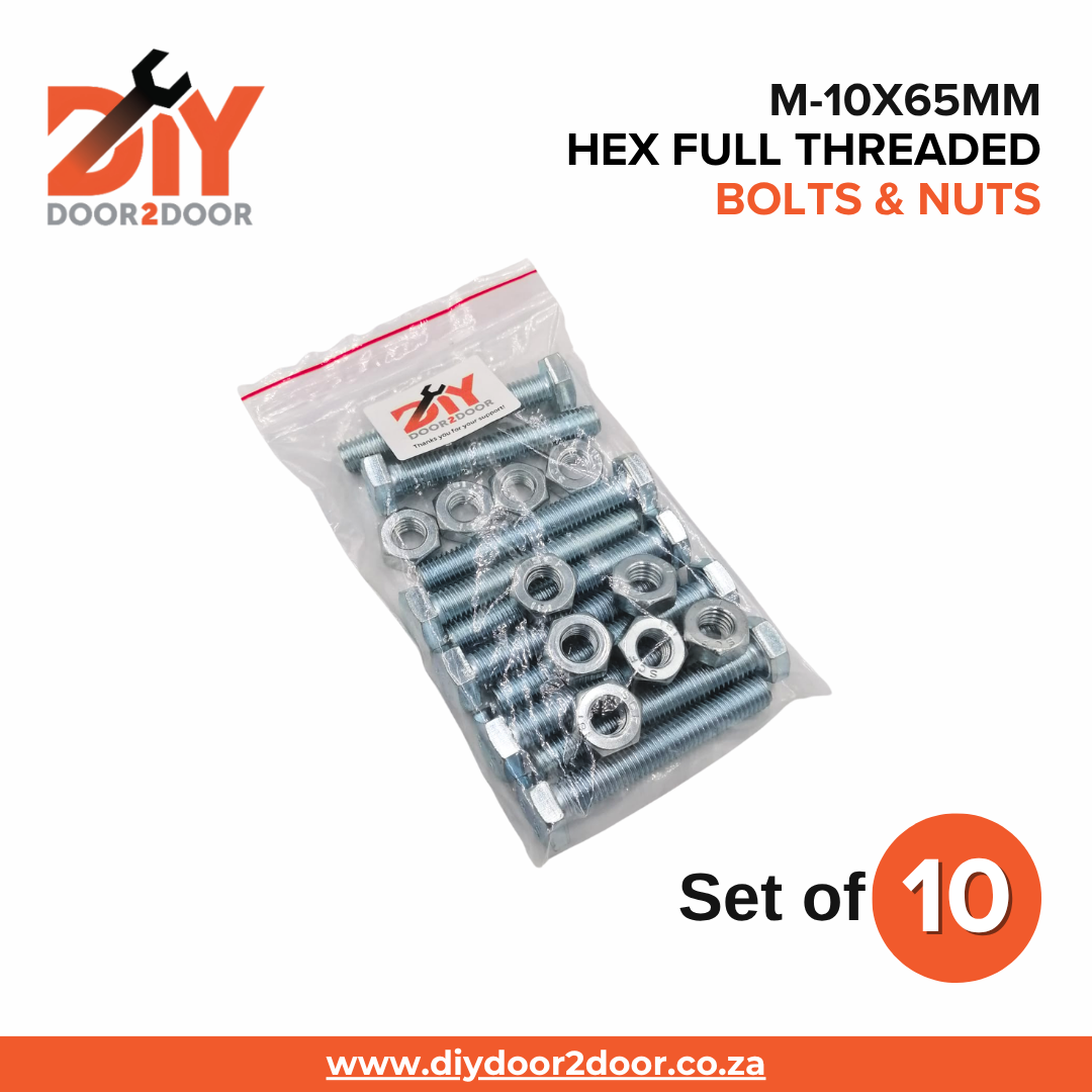 10PCS M-10X65MM HEX FULL THREADED BOLTS & NUTS SET