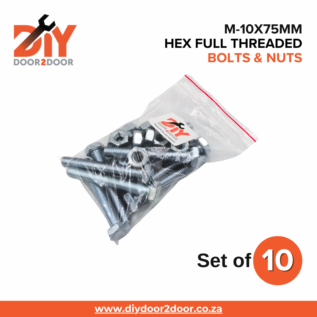- 10x DIYDOOR2DOOR M-10x75mm Hex Full Threaded Bolts.