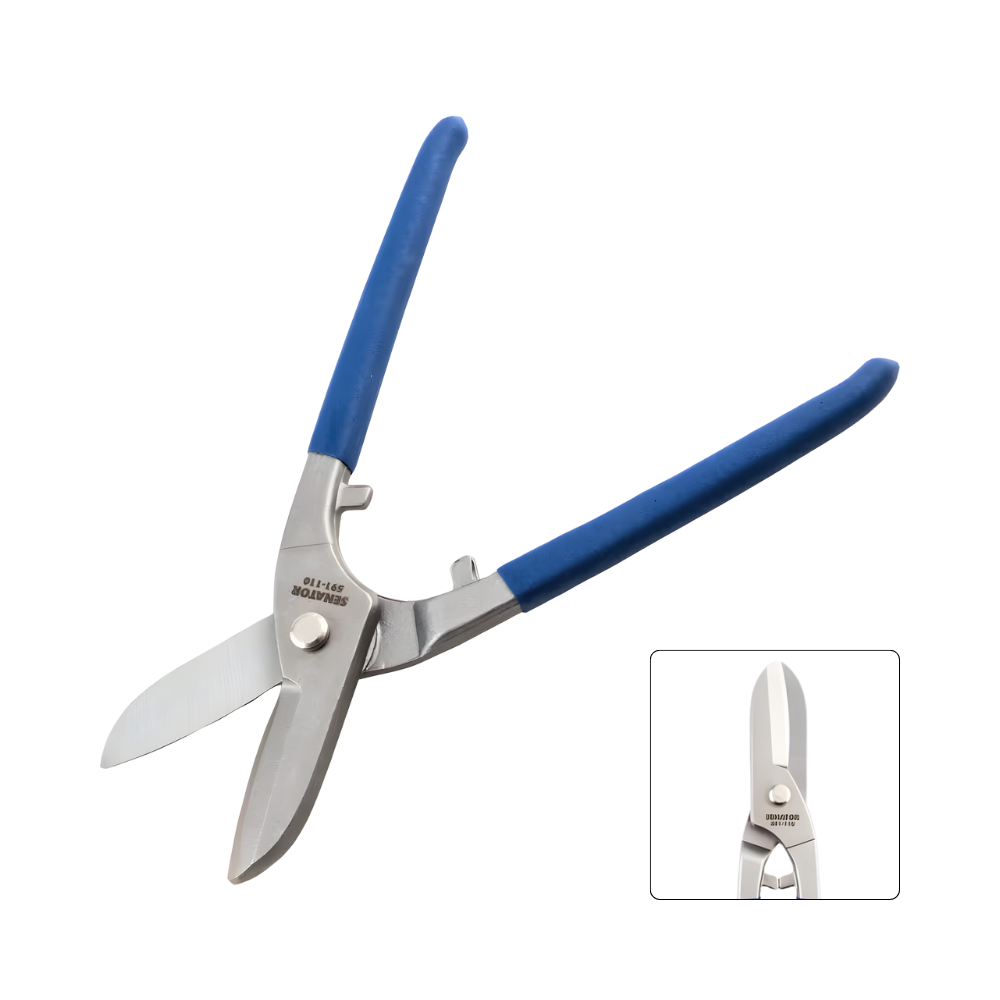 The SENATOR 10-INCH MANUAL STRAIGHT BLADE TIN-SNIP is a manual cutting tool designed for general-purpose cutting of sheet metal. Suitable for cutting materials like copper, aluminium and mild steel.