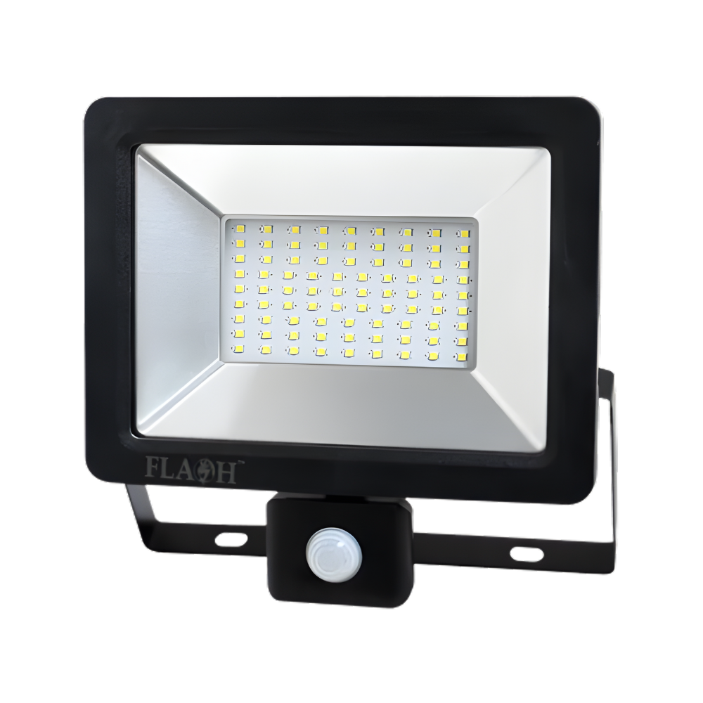 The FLASH 50W SLIM LED FLOODLIGHT (WITH PIR MOTION SENSOR) - DAYLIGHT 6000K is a powerful and efficient outdoor lighting solution. Its PIR motion sensor ensures efficient energy use by activating only when motion is detected, making it both effective and economical.
