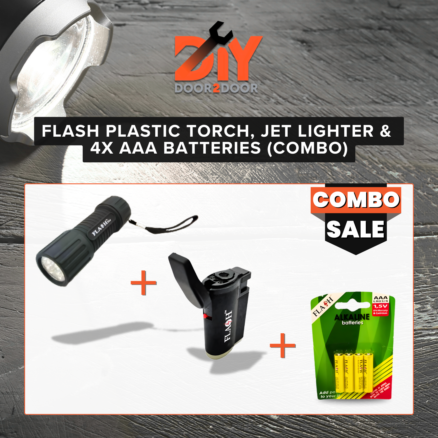 The FLASH PLASTIC TORCH, JET LIGHTER & 4X AAA BATTERIES (COMBO)